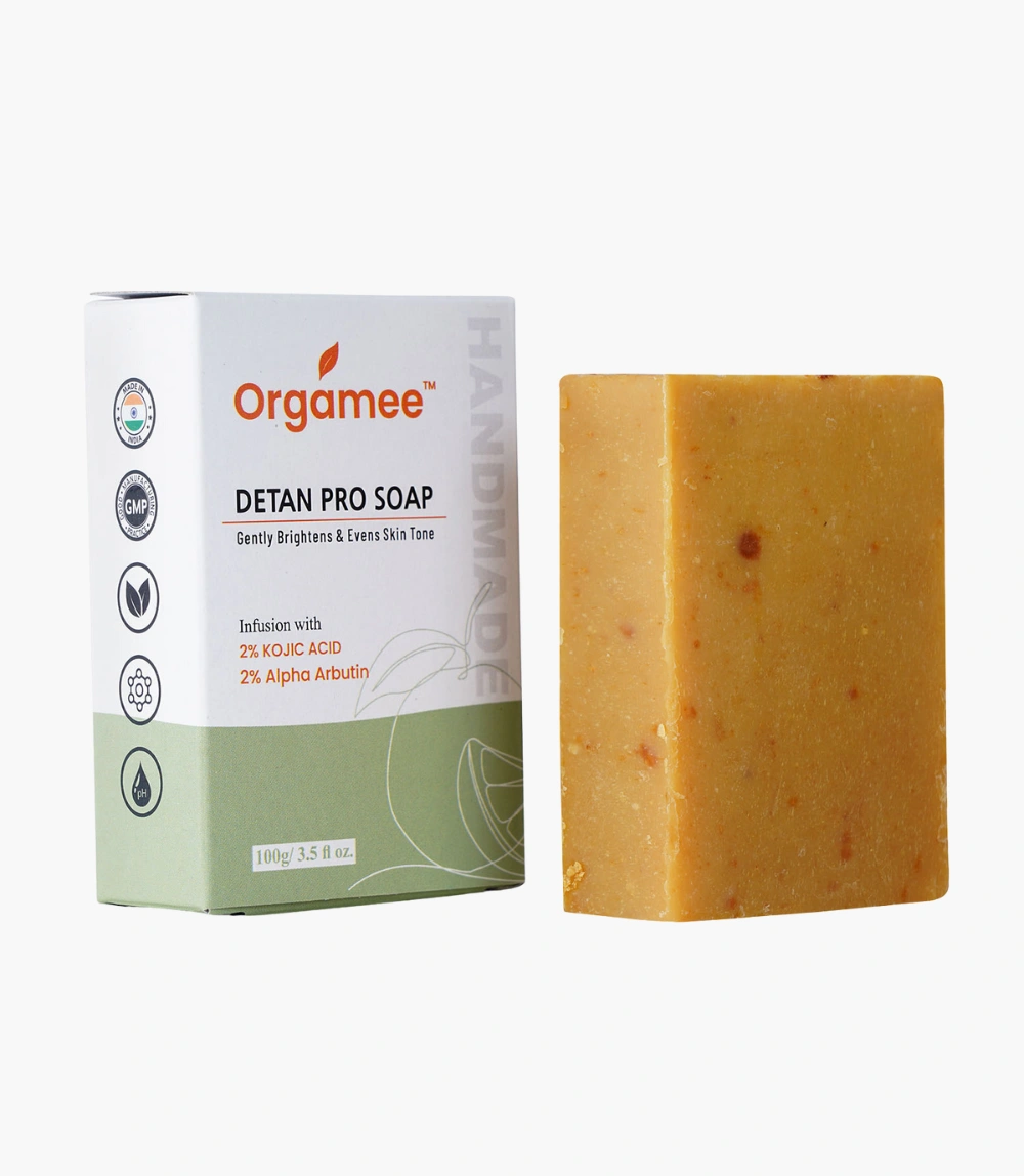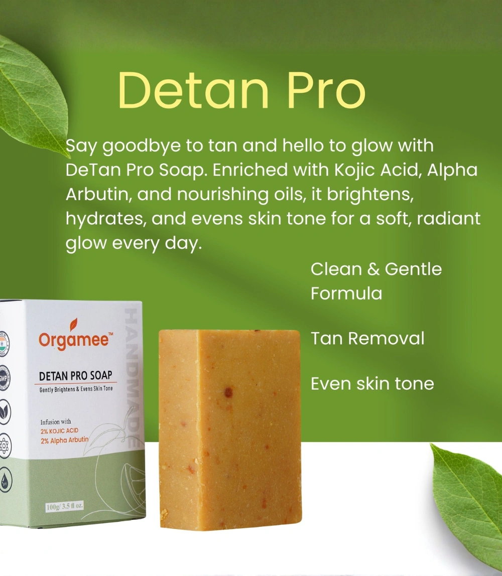 DeTan Pro Soap by Orgamee is a complete skincare solution designed to reduce tanning, dullness, and uneven skin tone. Crafted with nourishing oils and powerful brightening actives, it gently cleanses while helping restore your skin’s natural glow.